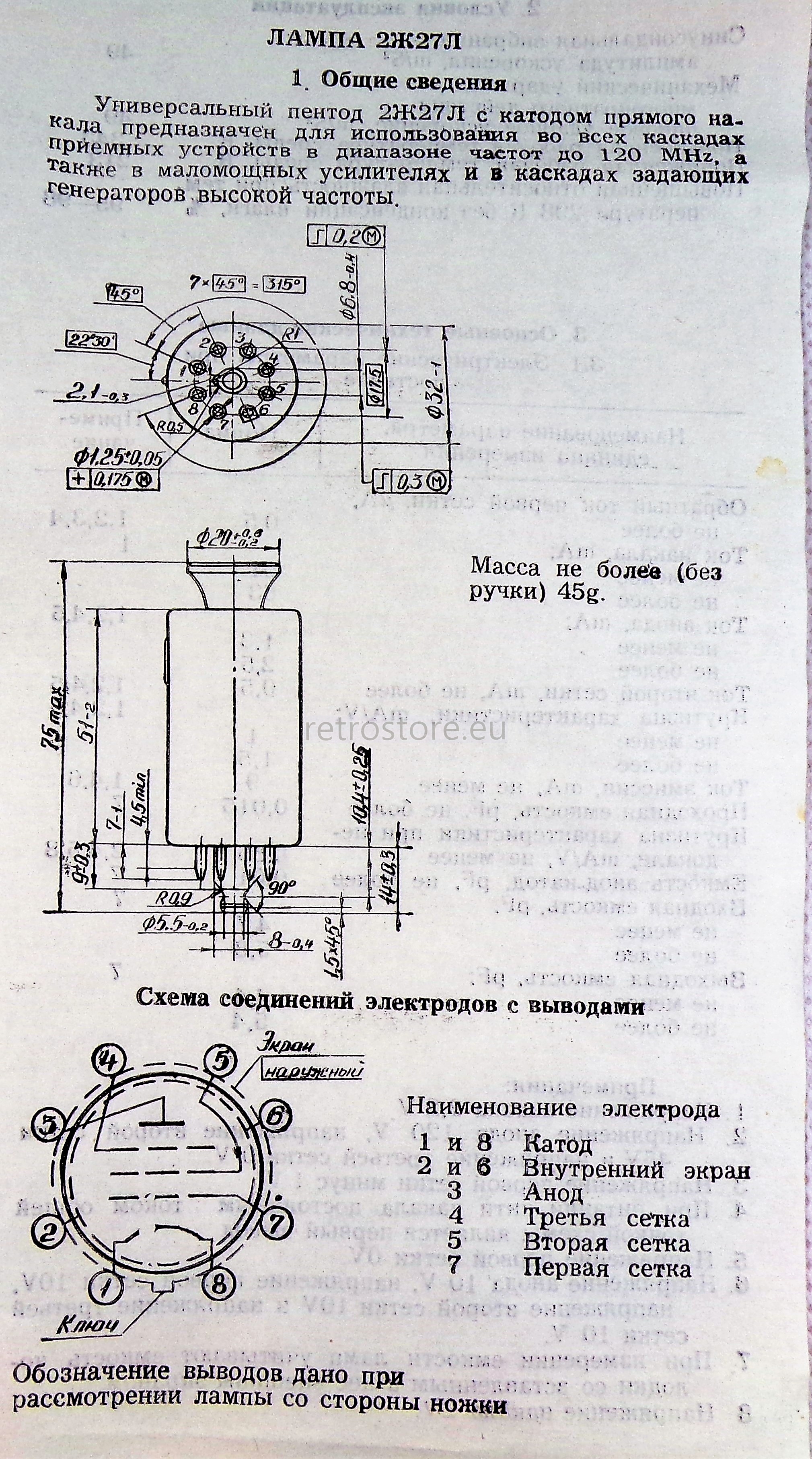 Russian directly heated universal pentode 2J27L (2Ж27Л) was designed for HF voltage amplification up to 120 MHz in battery powered equipment. It was developed alongside the 4P1L after second world war. This pentode operates in any position. It is a small tube in aluminum shield. New old stock. Years of production: 1960 and 1961.