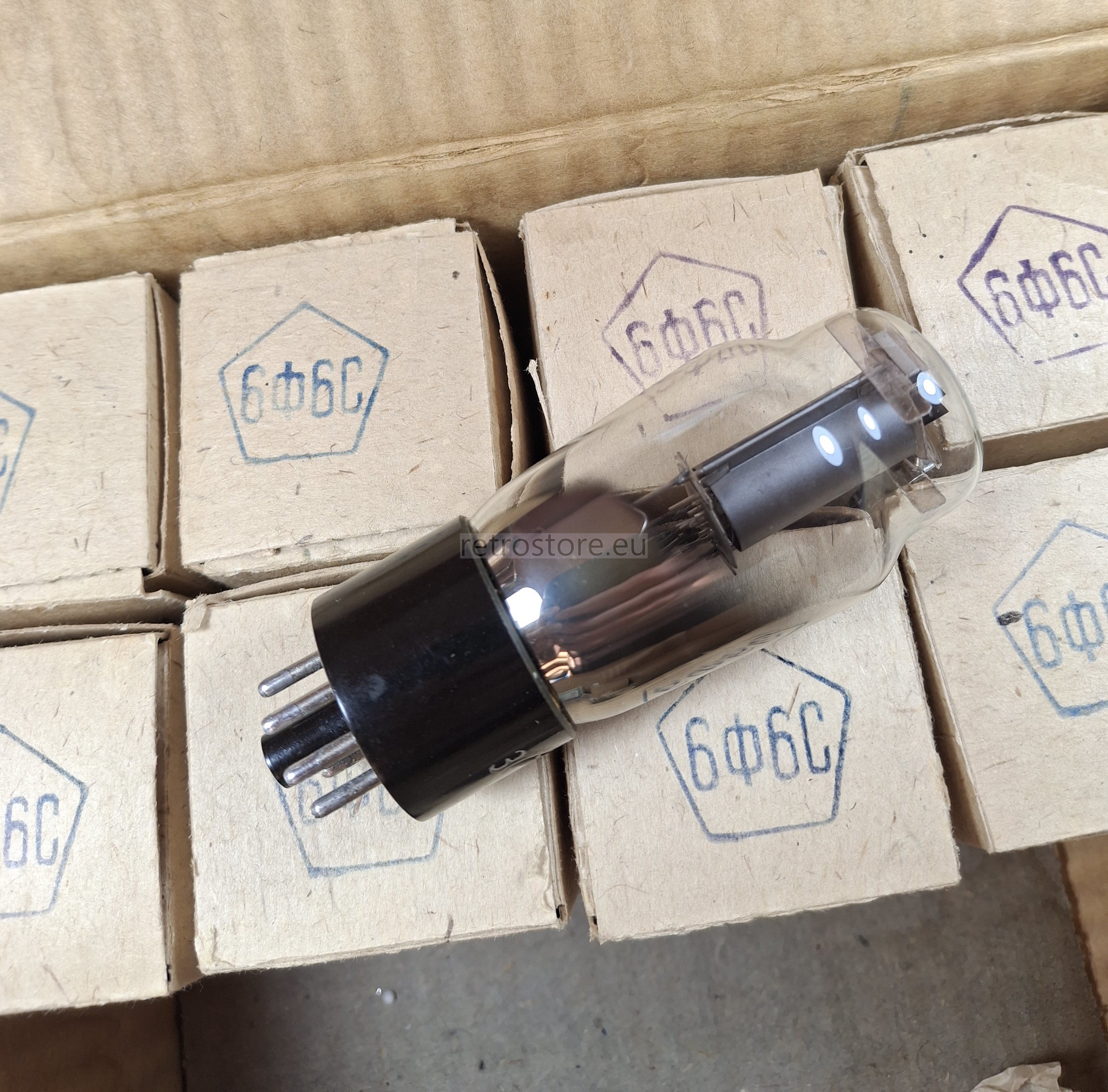 Electron tube 6F6S (6Ф6С) is a pentode, which was designed for usage in output stages of low-frequency amplifiers. This is the older "figural" version of the 6F6S tube, which is nowadays quite scarce. It is direct replacement for the american 6F6G, but also for the VT66-A and CV1911 tubes. New in box tubes. Year of production: 1957. Tested.