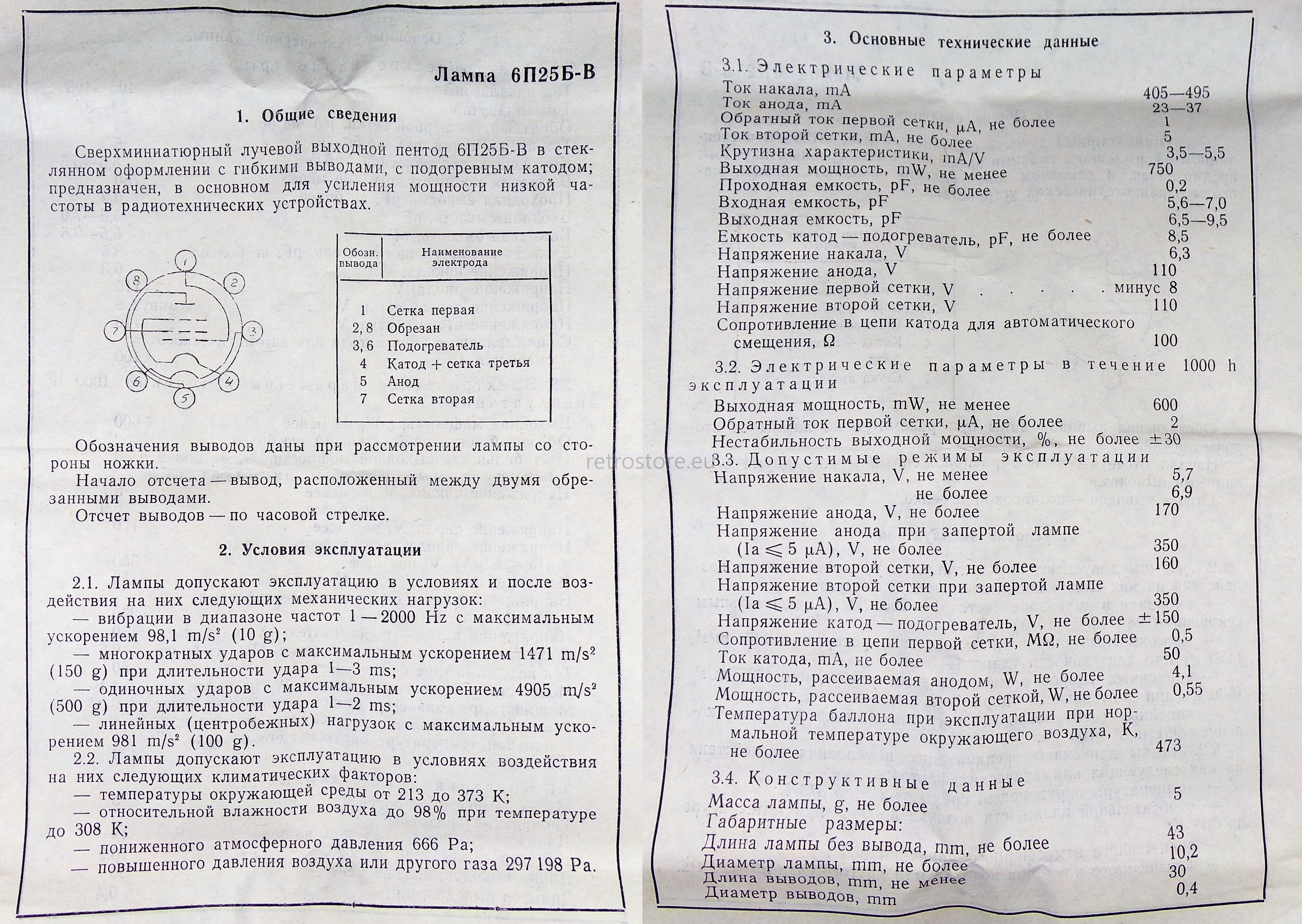 6P25B-V (6П25Б-B) is a russian subminiature output pentode with increased durability and reliability (-V). Application: LF power amplification. Service life guarantee: not less than 1000 operating hours. New old stock. Year of production: 1988 (please look at the gallery pictures).