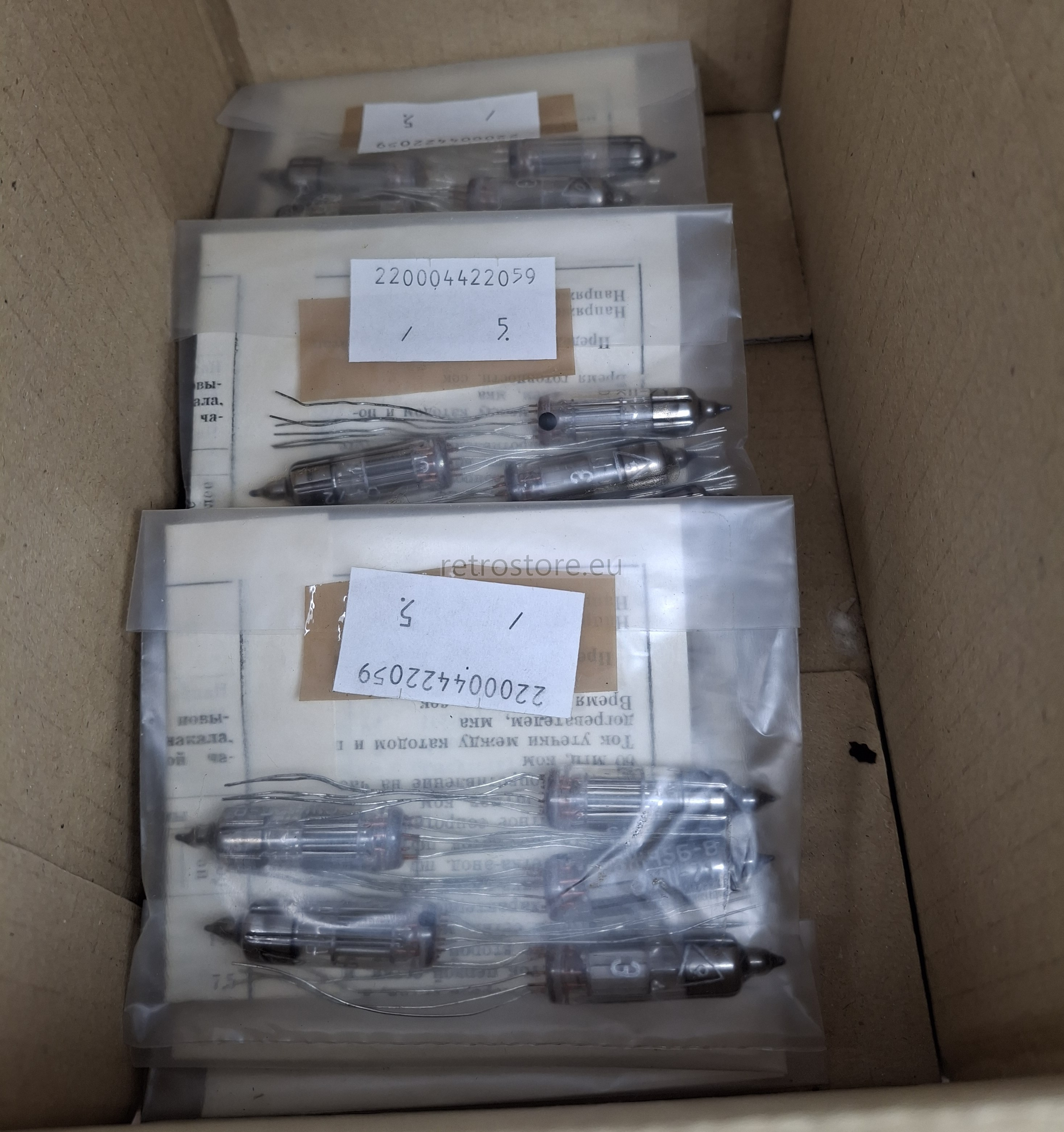 Electron tube 6J45B-V (6Ж45Б-B) is a soviet subminiature pentode with improved mechanical strength and reliability. Minimum service life: 2000 operating hours under prescribed conditions. New old stock. Made in the NEVZ (Novosibirsk) factory. Years of production: 1971 and 1972