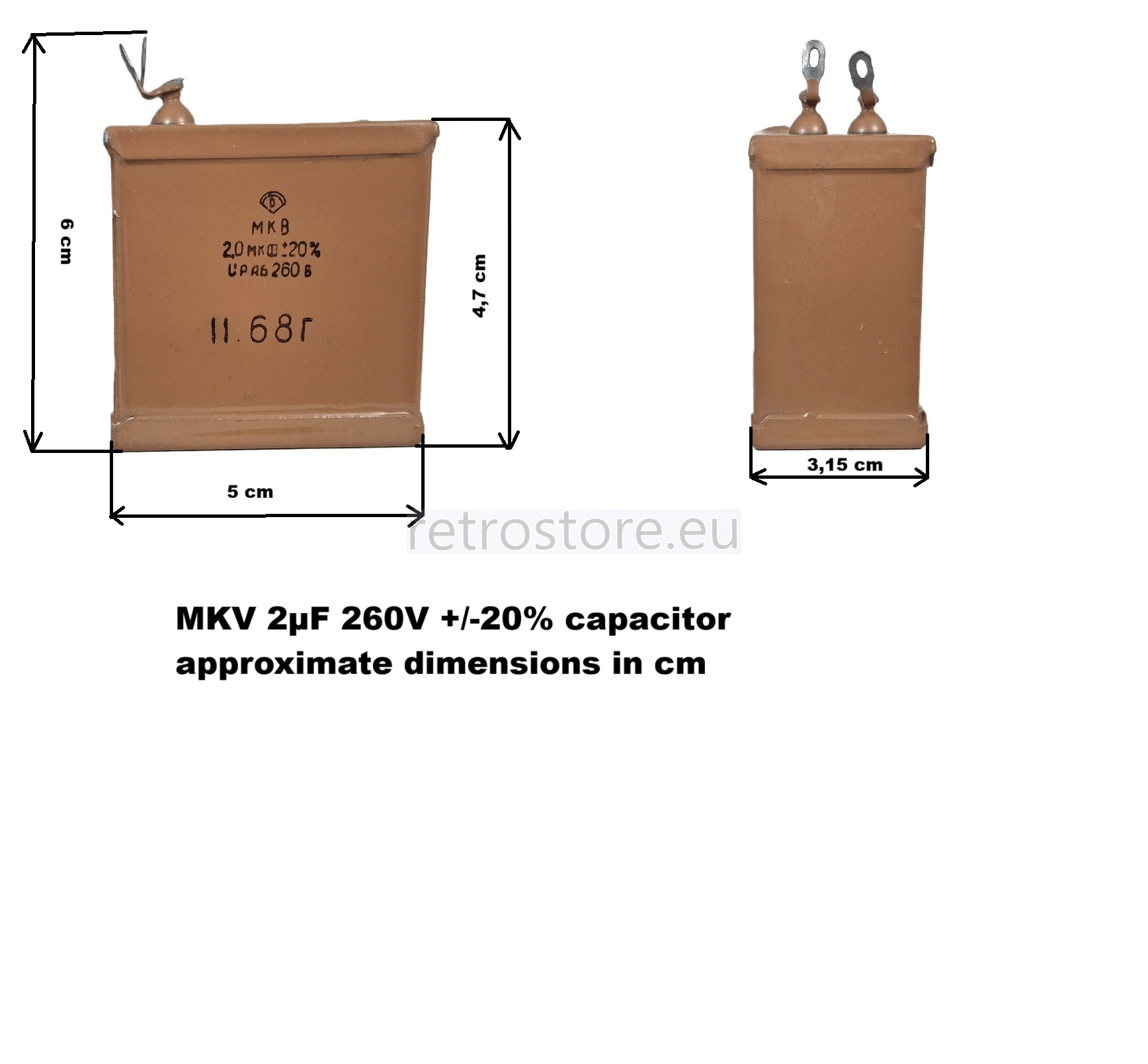 Vintage russian capacitor (МКВ) 2µF 260V ±20% is nowadays very rare and it was produced in smaller series for military equipment. Exceptional sound quality of these capacitors is comparable to Jensen. Plates are made from staniol, what is a foil made of tin. At capacitors assembling, paper and staniol are saturated by dehydrated paraffin as dielectric. New old stock items and in perfect condition. Year of production: 1968 (please look at the gallery pictures).